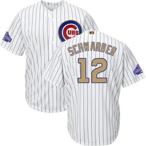 Authentic MLB Cubs #12 Kyle Schwarber White(Blue Strip) Gold Program Cool Base Stitched MLB Jersey