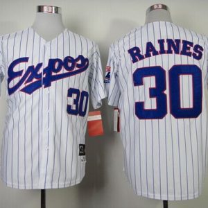 Authentic MLB Mitchell and Ness 1982 Expos #30 Tim Raines White Blue Strip Stitched Throwback MLB Jersey
